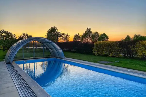 Outdoor swimming pool — a seasonal space for refreshment, set among greenery in the old orchard