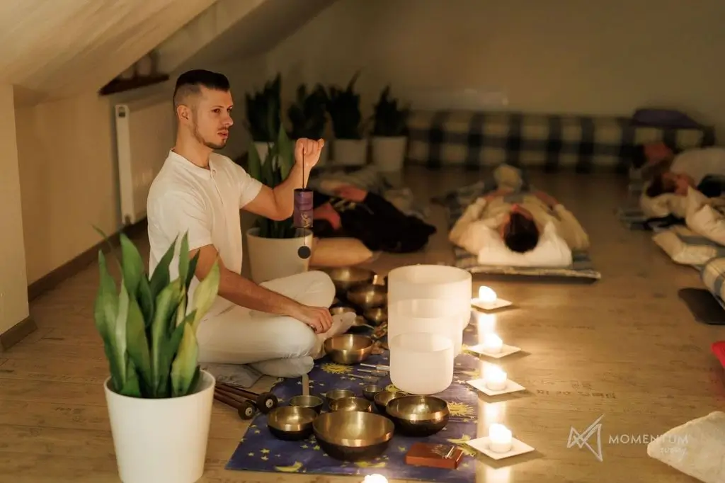 In the third stage, Tibetan singing bowls are gently placed on the body to release tension in the abdominal area, hips, and chest, harmonizing the heart space and the entire energetic body.